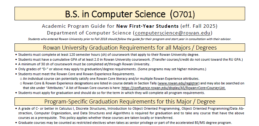 The Pre-Fall 2025 Admits, BS Program Guide contains requirements to fulfill the major and suggested course sequence.